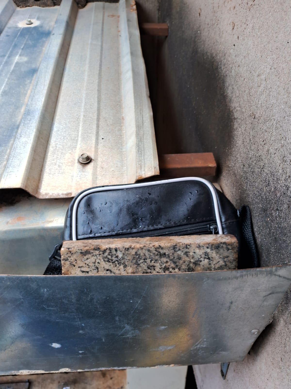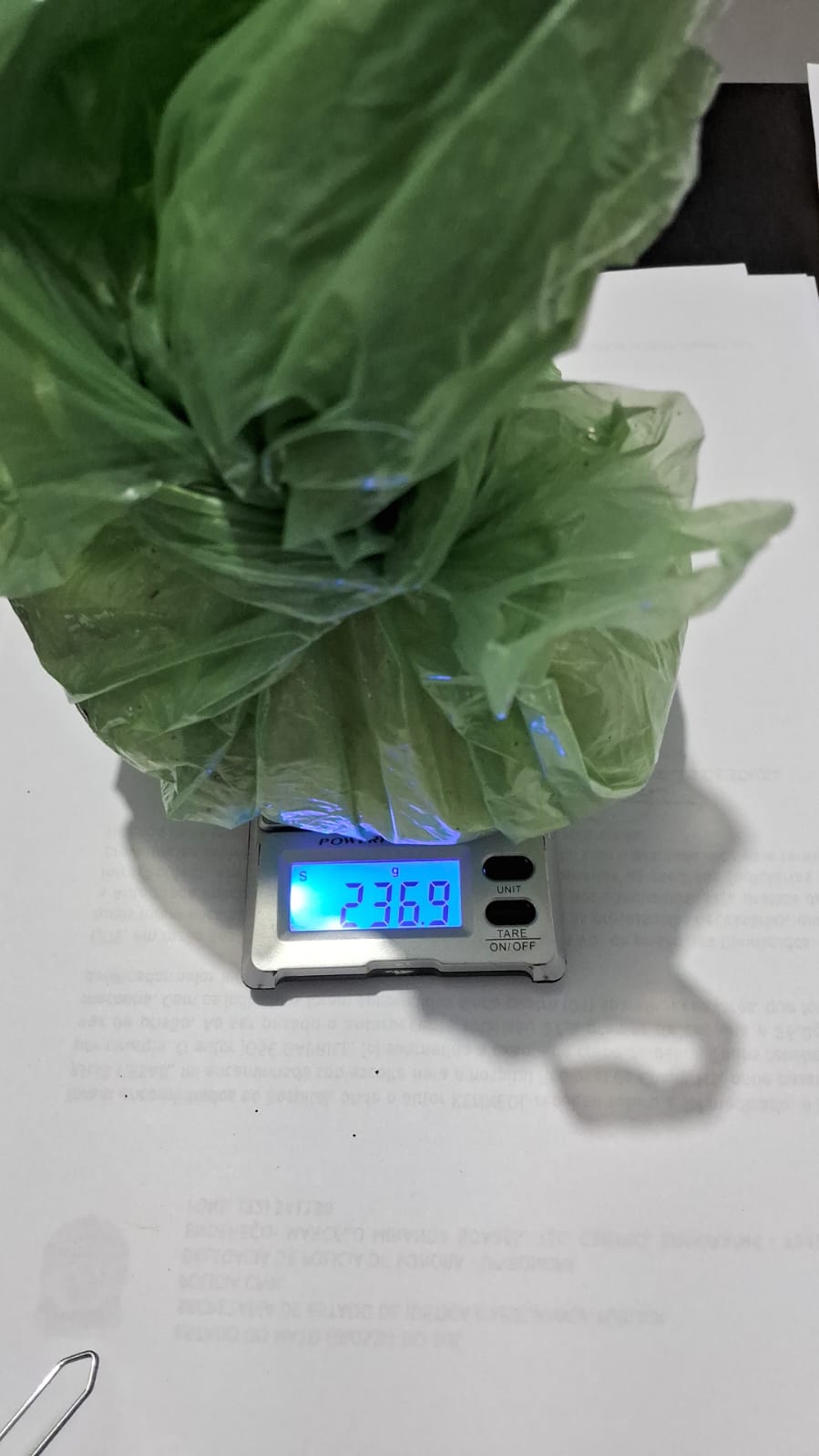 Em continuidade às investigações. A equipe recebeu a informação na data de hoje 17/02, de que indivíduos possivelmente do CV, teriam ido até a residência, alugada pelos criminosos, possivelmente em busca de drogas ou armas que pudessem estar escondidas. A equipe resolveu fazer uma busca mais minuciosa no imóvel, olhando inclusive o telhado e com a ajuda de uma escada, na calha localizada nos fundos, encontrou uma bolsa preta, com a escrita Oakley. No interior, dentro de uma sacola plástica, foi encontrada substância análoga a cocaína, que ao ser pesada totalizou 236,9g..