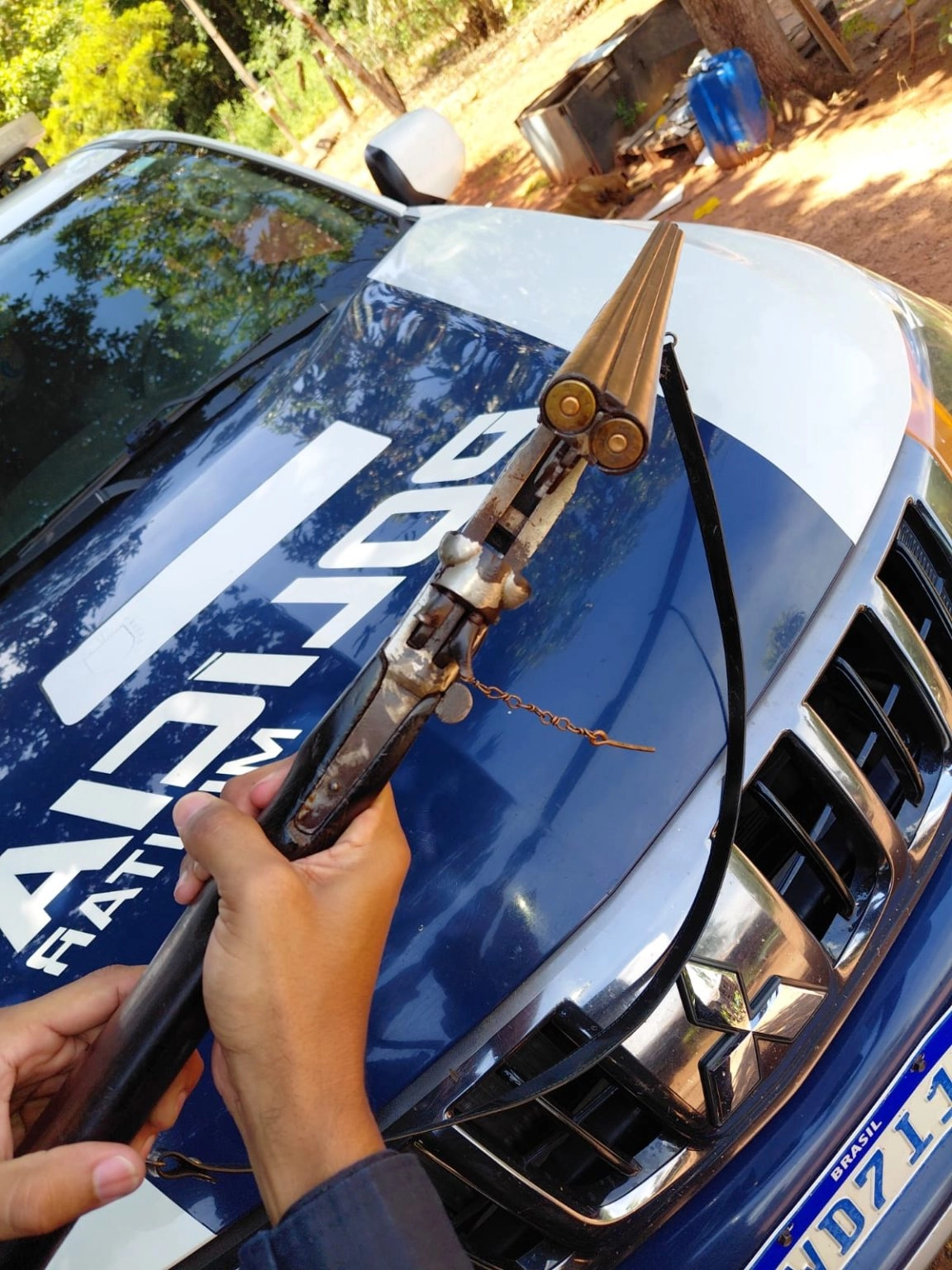 Durante buscas no interior da residência, os militares localizaram uma espingarda calibre .28, de dois canos, sem identificação aparente, carregada com duas munições e pronta para uso, escondida atrás de um guarda-roupas. Também foi encontrado um cinto porta-munições contendo mais 19 cartuchos intactos, totalizando 21 munições do mesmo calibre.