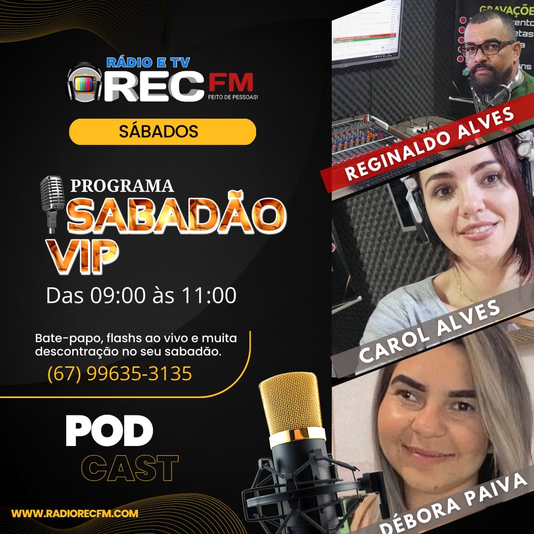 O Programa Sabadão Vip esta no ar das 09:00 as 11:00 da manhã todos os Sabados. Na apresentação dos Locutores Carol Alves, Débora Paiva e Reginaldo Alves.
