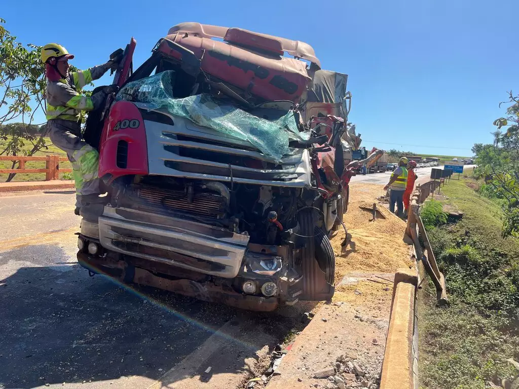 Um motorista ficou gravemente ferido e preso às ferragens, na manhã desta quarta-feira (18), após um acidente impressionante na BR-163, em Sonora MS.O caminhão que ele dirigia - com carga de soja - teve a cabine completamente destruída ao bater contra uma máquina agrícola que tomava conta da pista.A colisão aconteceu por volta das 9h, a cerca de 10 km do perímetro urbano de Sonora. A máquina agrícola, que era transportada por outro caminhão, ultrapassava as laterais da carroceria. Dois veículos batedores faziam o acompanhamento: um seguia à frente, alertando motoristas que o trecho estava intransitável; o outro, atrás.